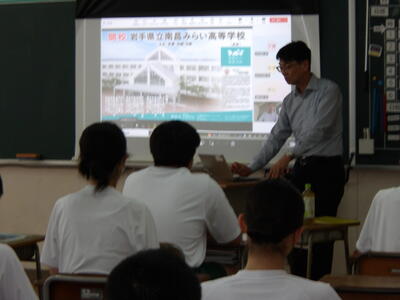 盛岡工業高校、盛岡商業高校、盛岡第一高校、盛岡第四高校、南昌みらい高校の5つの高校の先生方に来ていただき、各校の生活の概要や特色、求める生徒像、進路達成のために身につけておくべき力などについて説明していただきました。